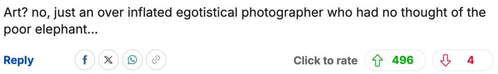 " 艺术?才不是,只是一个被自大填满、完全不考虑可怜大象的摄影师 …"