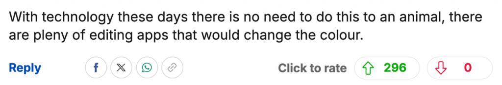 " 以现在的科技,根本没必要这样对待一只动物,有那么多可以改色的 P 图 APP。"