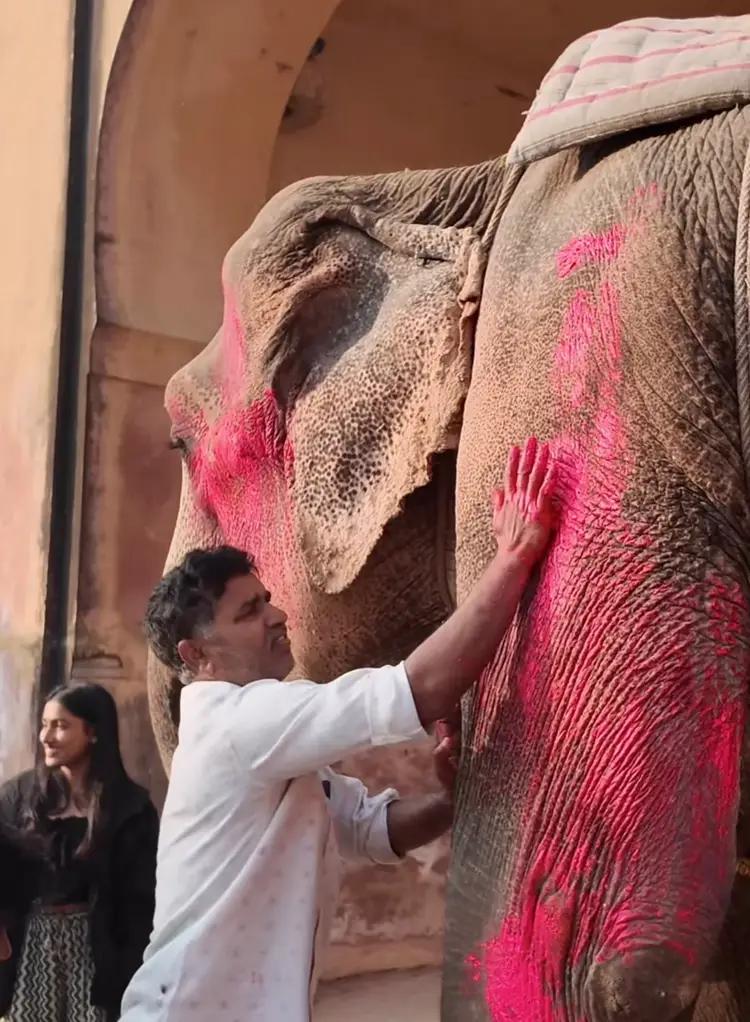 解释一:斋浦尔当地人过大象节的时候,也会给大象涂颜料。