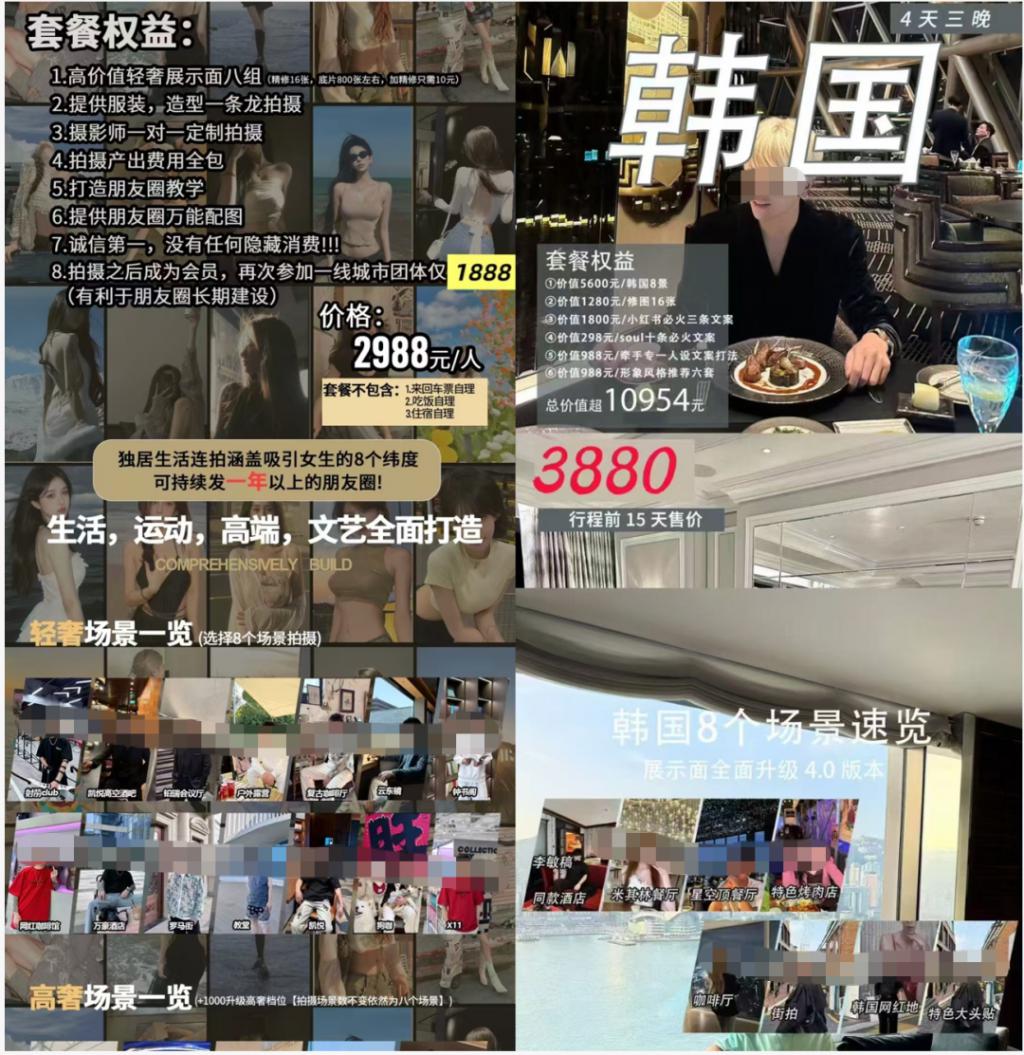有商家透露现在这个市场很卷,因此赛道内逐渐分化出一对一定制拍摄、带团去旅游城市和国外拍摄。某位商家提供的报价单显示,去韩国拍摄明星同款酒店、特色烤肉店等售价近 4000 元 / 人。此外他们还计划后续去欧洲多国环游拍摄,费用就有点高了。