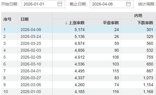 个股方面,全市场共计 5174 家股票收涨,超过了 3 月 24 日的 5136 家,成为年内表现最好的一天。