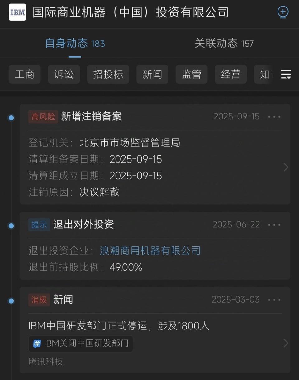 IBM CEO Arvind Krishna 在当时的一次内部会议中称:" 关闭中国研发部门的决定已完成,不可撤销。"2025 年 3 月,IBM 中国投资公司及其所有分公司停止了业务活动,并已于同年进行注销备案。