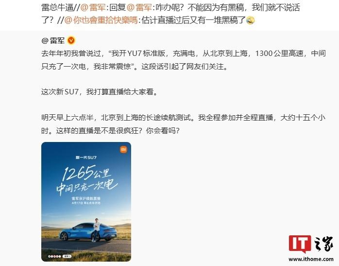 IT 之家 4 月 16 日消息,今天上午,小米创办人、董事长兼 CEO 雷军宣布,明天(4 月 17 日)早上六点半,将直播新一代小米 SU7 从北京到上海的长途续航测试,雷军本人全程参加并全程直播,大约十五个小时。