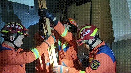 消防员爬上天花板跟男子沟通。图源:浙江消防