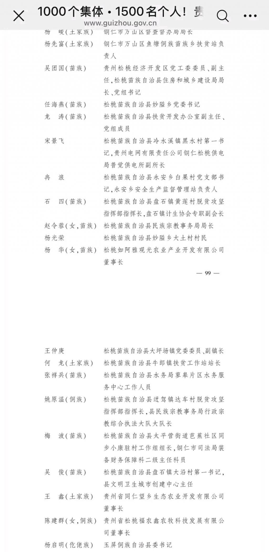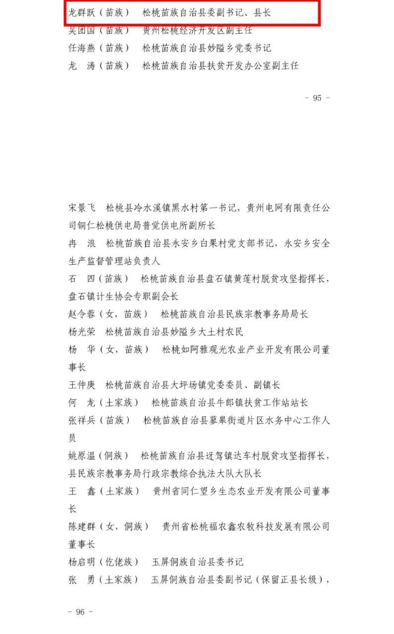 2021 年 4 月 14 日,贵州省发布公示:经贵州省脱贫攻坚总结表彰工作领导小组研究决定,确定贵阳市委办公厅等 1084 个集体为贵州省脱贫攻坚先进集体拟表彰对象 ( 含备选对象 ) 、刘明兰等 1655 人为贵州省脱贫攻坚先进个人拟表彰对象 ( 含备选对象 ) 。公示期为 4 月 14 日— 4 月 20 日。该公示名单中,松桃县一共有 16 人,其中时任松桃县县长的龙群跃在拟表彰名单中。