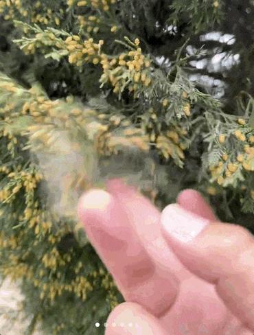 其实早在初春,圆柏的花粉就已经扛着刀杀过来了。在柏树繁殖时,雄性圆柏会长出黄色花粉苞,轻轻一碰,就喷出黄色的花粉。