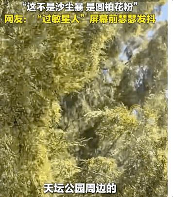 天坛公园的柏树花粉,可以说是全国之最。风一吹,整棵柏树都蒸腾着黄色的烟气。风再大一点,简直就跟沙尘暴一样。
