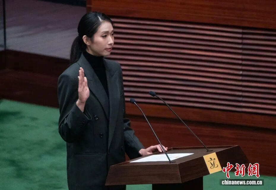 2026 年 1 月 1 日,香港特区第八届立法会举行议员宣誓仪式。90 名议员在香港特区行政长官李家超监誓下,依次完成庄严宣誓。图为议员江旻憓宣誓。中新社记者 侯宇 摄