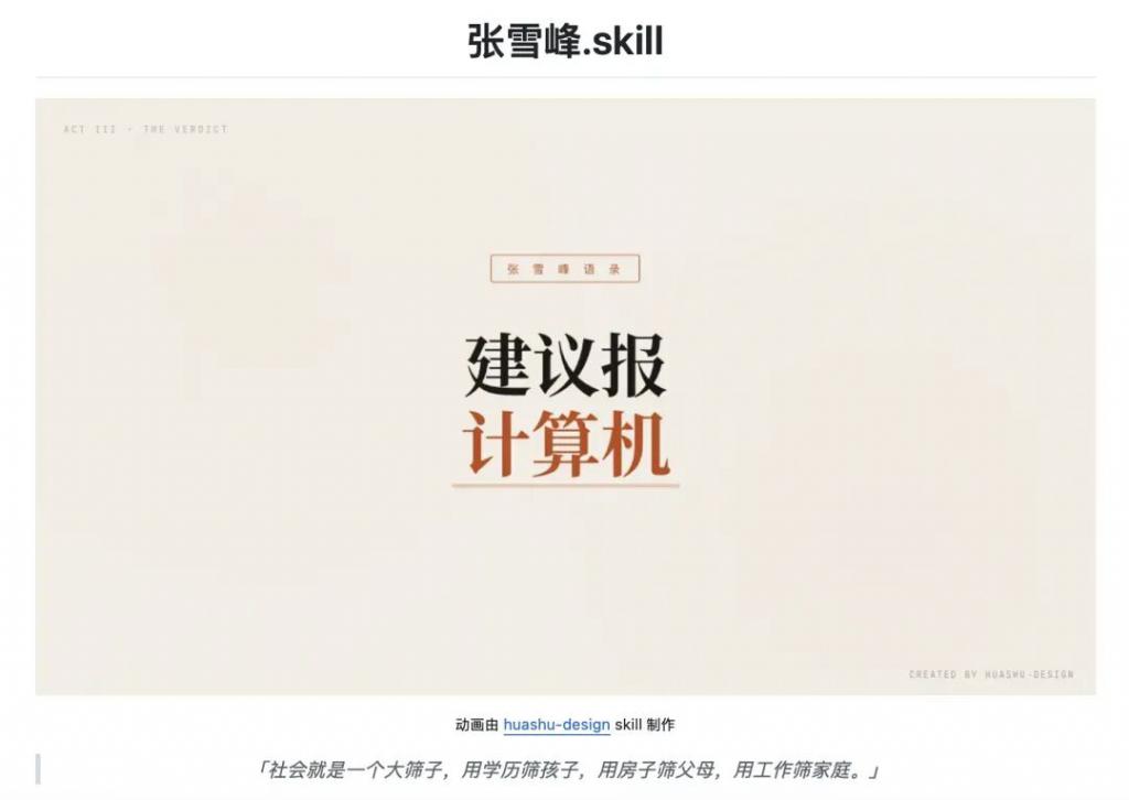 于是,三个小时后," 女娲 .skill" 诞生了,这个项目可以蒸馏任何公众人物。花叔从张雪峰生前的 5 本著作、十余篇深度采访和 30 多条一手语录中,提炼出他的咨询风格、决策逻辑和表达习惯,打包成一个可以随时调用的 skill。