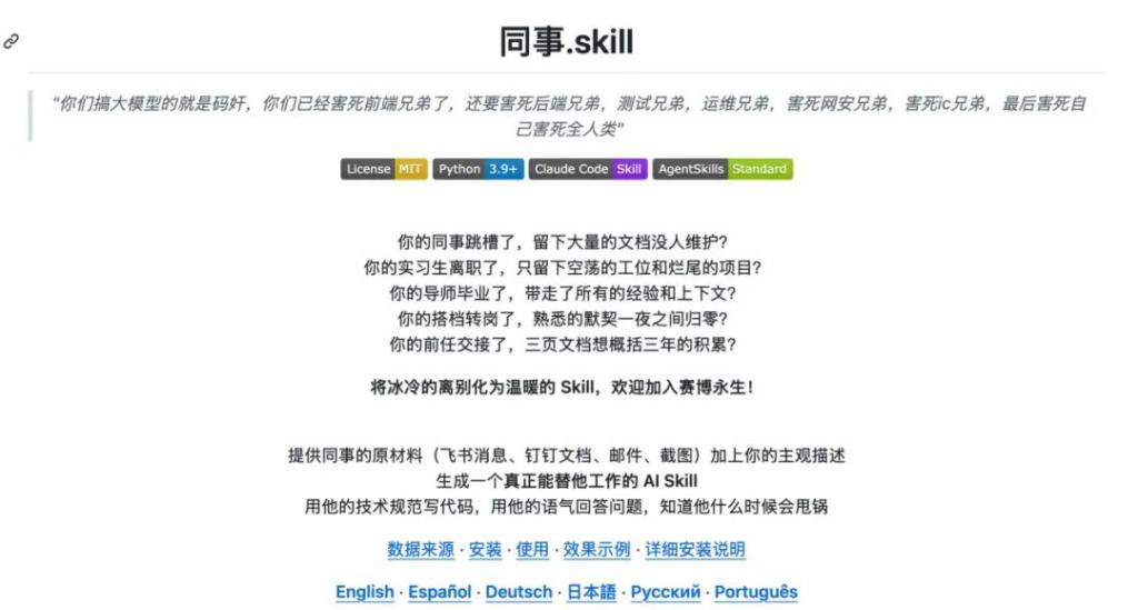 最初引爆舆论的是 " 同事 .skill",此项目于 3 月 30 日在 GitHub 上线。想要 " 复制 " 一个离职同事,做法并不复杂,简单来说,就是把离职同事在工作软件上的聊天记录、工作文档、邮件往来等信息 " 喂给 "AI,让 AI 从中提取出这个人的技术规范、决策路径、沟通习惯,甚至说话语气,最终生成一份 skill 文件。接入这份 skill 就能在一定程度上模仿那个人的工作方式,用他的逻辑写代码,用他的口吻回消息,甚至知道他什么时候会甩锅。