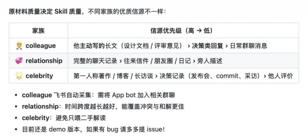 " 同事 .skill" 主页显示,提供给 Skill 的信源有优先级区分