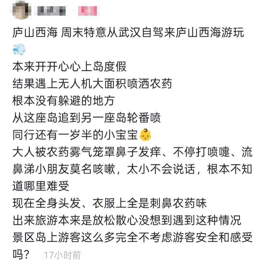 4 月 26 日,庐山西海景区工作人员称岛上确实有针对植物的作业,但喷洒的物质不会对人造成伤害,每个人的情绪、感受是不一样的," 昨天已经有人反馈这件事,我们正在积极解决,后续可能会发通告,如果真觉得身体有不适,请尽快跟我们联系 ",至于喷洒的物质,该工作人员称不清楚,需要由参与作业的人来解释,不过截至发稿前暂无人回复," 给植物用的,但岛上也有工作人员在,如果有伤害我们自己的工作人员同样会受影响,若真像有人说的那样,我们不可能自己的员工都不顾。"