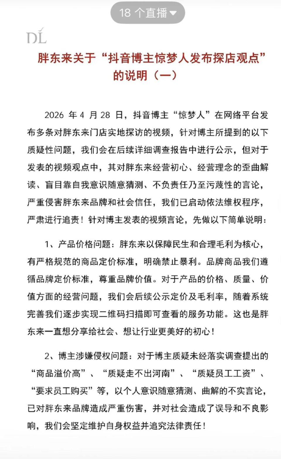 公示毛利率、启动法律维权,4 月 29 日,胖东来正式回应了博主 " 惊梦人 " 此前针对其 "249 元毛巾 " 及经营管理提出的多项质疑。