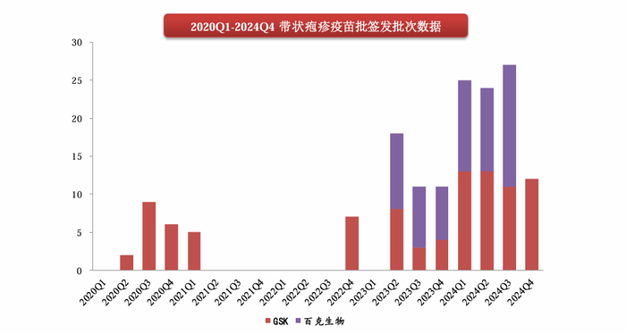 据西南证券统计,2024财年,带状疱疹疫苗批签发88批次,其中百克生物批签发39批次,GSK批签发49批次。