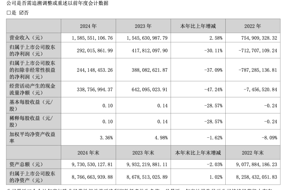 2024年年度报告则是营收微增,净利润同比双位数下降,去年营业收入为15.86亿元,同比增长2.58%。归属于上市公司股东的净利润为2.92亿元,同比减少30.11%。归属于上市公司股东的扣除非经常性损益的净利润为2.44亿元,同比减少37.09%。基本每股收益为0.1元。此外,拟向全体股东每10股派发现金红利2元(含税)。