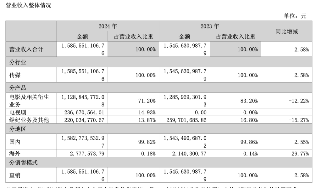 聚焦光线传媒三大业务板块在2024年的表现,该公司电影及相关衍生业务2024年营业收入约为11.29亿元,占总营业收入的71.20%,较2023年下降了12.22%;电视剧营收约为2.37亿元,占总营业收入的14.93%;经纪业务及其他营收为2.20亿元,占总营业收入的13.87%,较2023年下降了15.27%。