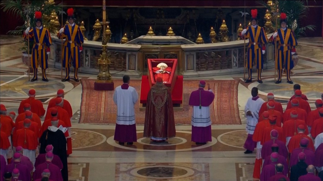 方济各躺在一个敞开的棺材里,面向哀悼者,四名瑞士卫兵立正。当人群来到灵柩前,许多人举起智能手机拍照。