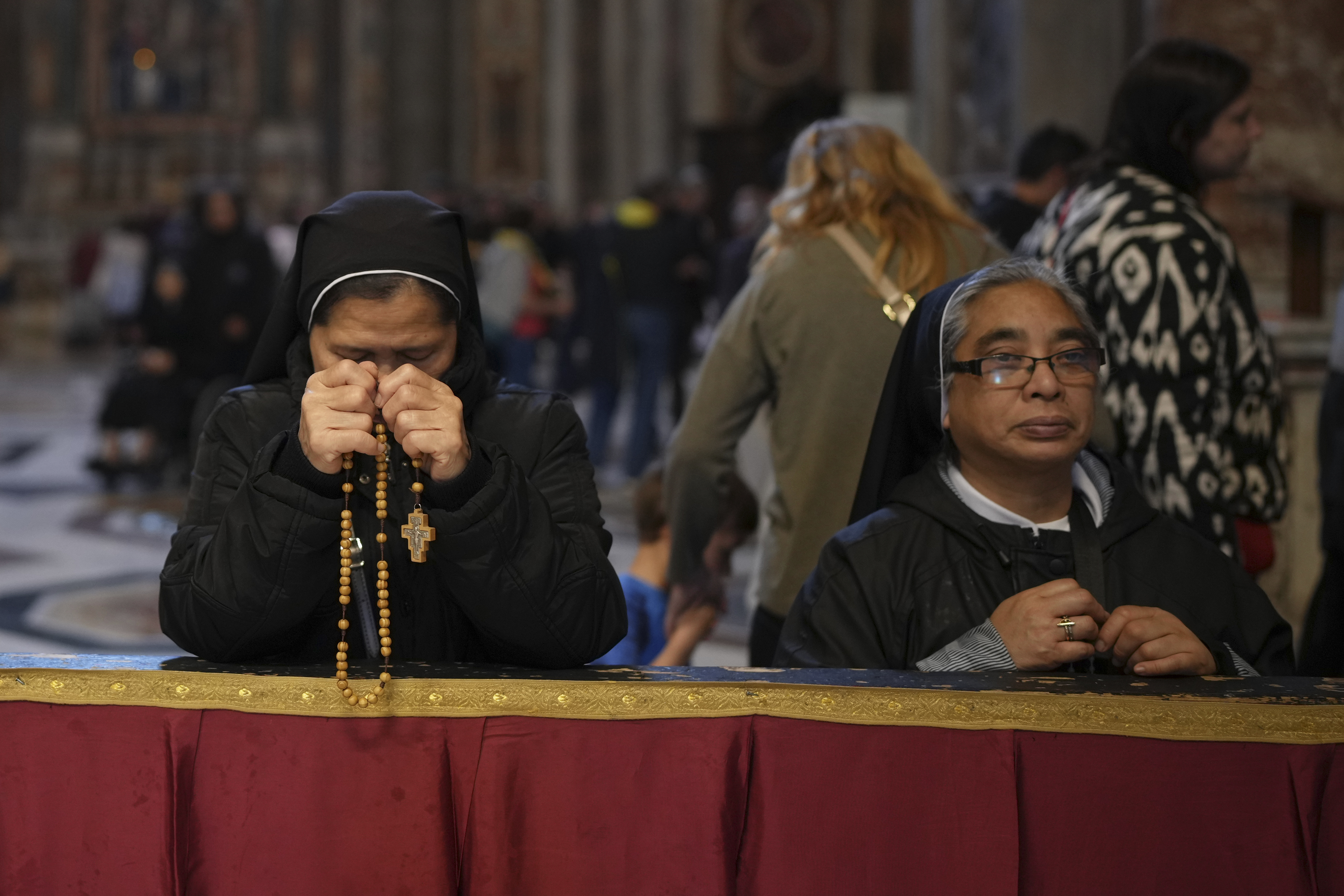 2025年4月24日,星期四,梵蒂冈,修女们在教皇方济各瞻仰的圣彼得大教堂内祈祷。(美联社图片/亚历山德拉·塔伦蒂诺)。