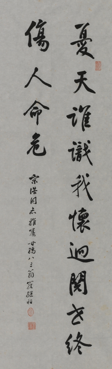 贵老请罗老给大家都留下墨宝,罗老也欣然答应,临行给每人写了一个条幅。给苏老写的是“征夫陌头杨柳色,羁人客里杜鹃声。”给黄社长和潘英伟君写的内容我不记得了。给我写的是“憂天誰識我懷迥,閱世終傷人命危。宋浩同志雅囑。甘孺八三翁羅繼祖。”因为有“人命危”三字,我颇为不喜,但后来疫情几年,脑海里时不时冒出的,总是罗老的这幅字。这句是罗老的自撰联语,后来也收进了《两启轩韵语》。拿给我们这些条幅时,王同策先生说,罗老的白内障严重,目力模糊,写这些条幅时都是由他拉纸,罗老在同一个位置落笔,但字写得真是好。后来,罗老白内障术后复明非常高兴,又给我写了一幅:“不妖不染意非禪,惟一惟精見性真。人間萬事爭清白,三复蓮溪說愛蓮。宋浩同志愛予《蓮溪愛蓮詩》,書來請寫,即乞兩教。丁丑初秋廿四日,甘孺八五翁羅繼祖書于連灣白雲山莊。”钤印“甘翁復明後書”。反而不似此幅苍劲。