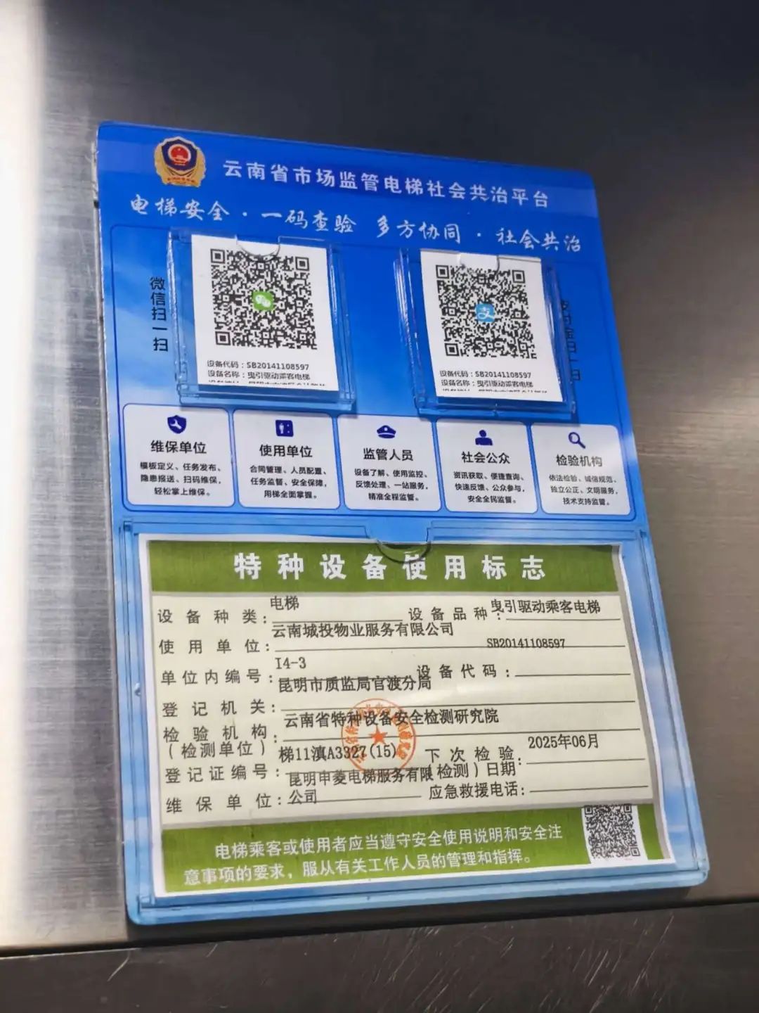 在电梯轿厢门靠上部分位置,粘贴有云南省特种设备安全检测研究院发出的“特种设备使用标志”,使用单位为:云南城投物业服务有限公司,下次检验时间为2025年6月。