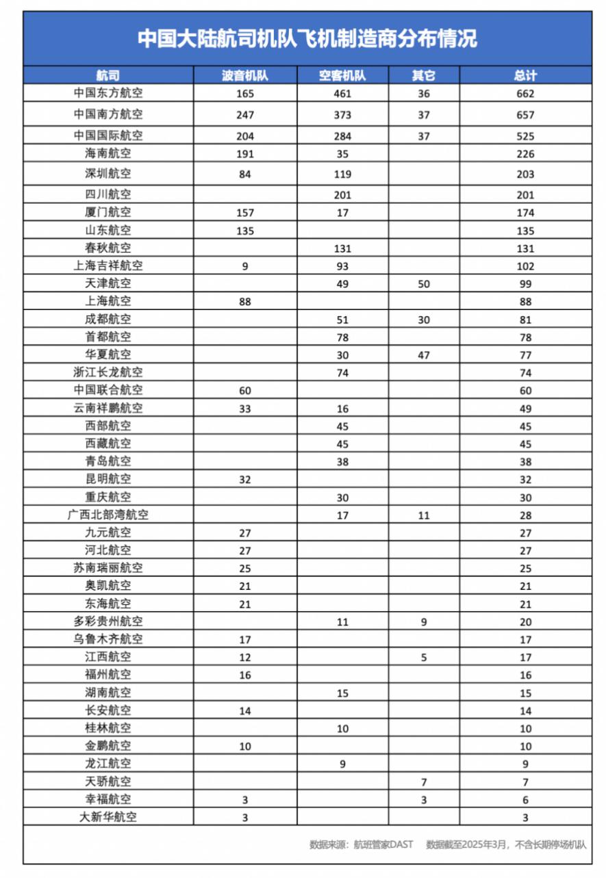根据航班管家数据,截至 2025 年 3 月,全波音机队的航司就有 14 家,主要为山东航空、上海航空、中国联合航空、昆明航空等航司,厦门航空波音机队占比达到了 90.2%,海南航空波音机队占比达到 84.5%。