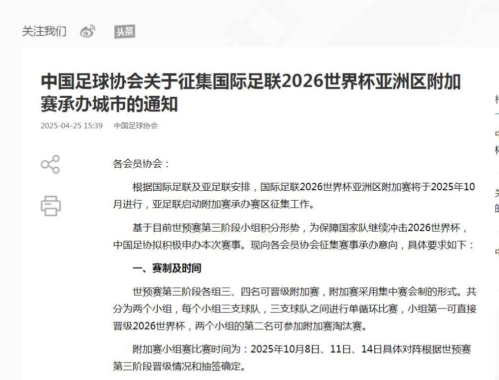 “根据国际足联及亚足联安排,国际足联2026世界杯亚洲区附加赛将于2025年10月进行,亚足联启动附加赛承办赛区征集工作。基于目前世预赛第三阶段(18强赛)小组积分形势,为保障国家队继续冲击2026世界杯,中国足协拟积极申办本次赛事。现向各会员协会征集赛事承办意向。”中国足协表示。
