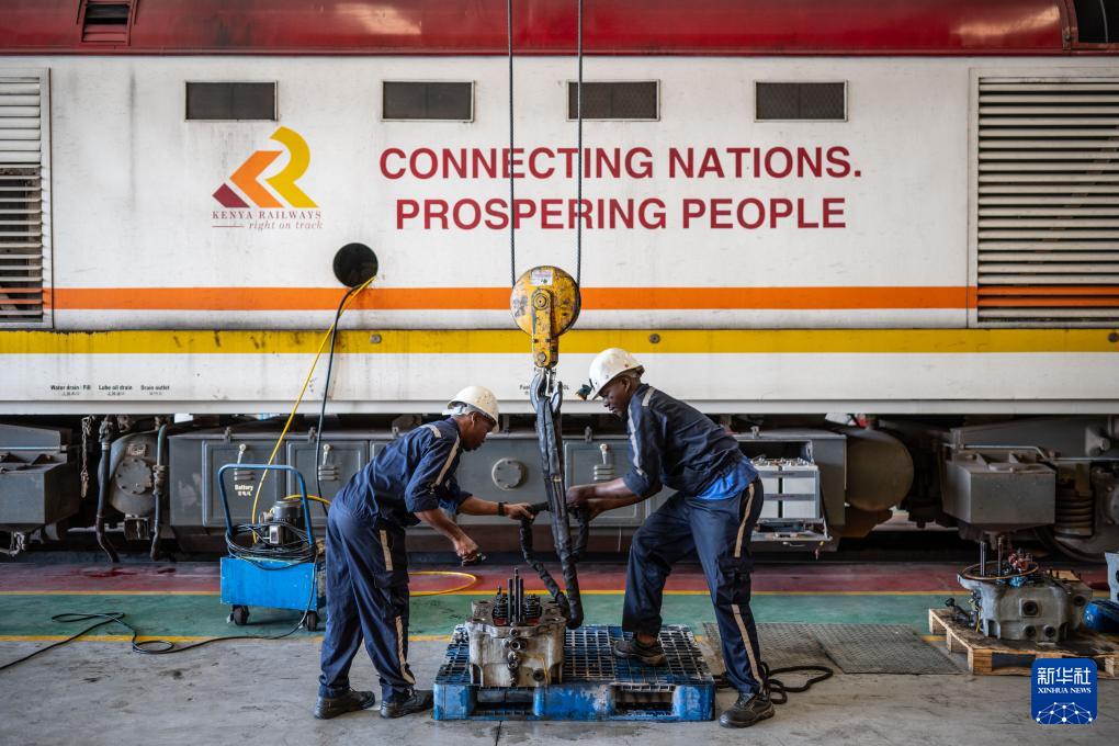 2025 年 1 月 23 日,在肯尼亚内罗毕蒙内铁路车间,维保人员在一辆印有 " 连接国家 走向繁荣 " 标语的蒙内铁路机车前检修配件。 新华社记者 王冠森 摄
