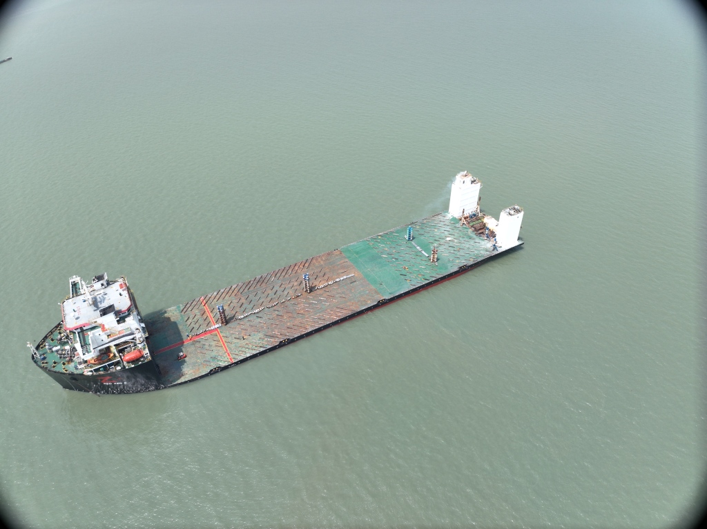 装载现场,在指挥人员的调度下,“华洋2”轮缓缓下潜至预定深度,工作人员通过缆绳与拖轮紧密配合,使货物稳稳抵达预定位置。经过数小时连续奋战,半潜船完成装载并顺利浮出水面,经全面检查,四艘货物均准确无误坐落在垫木上。