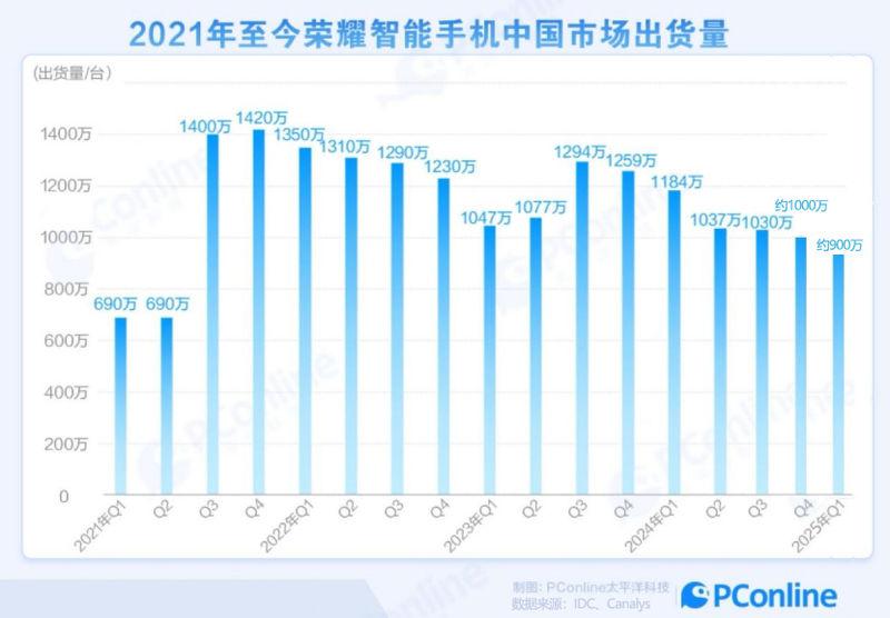 而今年一季度,在国内市场整体增长的情况下,荣耀再次出现下滑,出货量降至约 900 万台,创下其最近 15 个季度新低,仅略高于 2021 年初荣耀刚刚独立时的调整期。