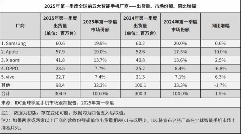 而在全球市场,小米同样表现不错。据 IDC 数据,今年一季度,小米智能手机全球出货量 4180 万台,同比增长 2.5%,市场份额 13.7%,稳居全球第三,OPPO 和 vivo 分别位列全球第四和第五。
