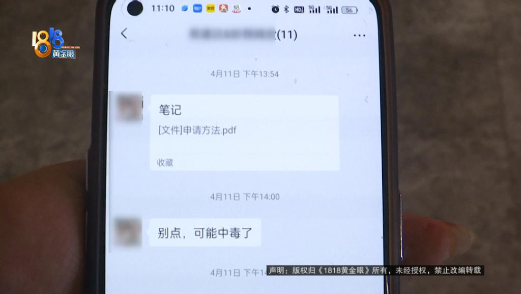 喻女士说,当时她没反应过来,只觉得是系统繁忙,就没再管它。结果 4 月 11 号下午,自己的微信账号无缘无故在工作群中发送了一篇笔记,她才发现不对,连忙提醒同事们别点,说是可能 " 中毒 " 了。