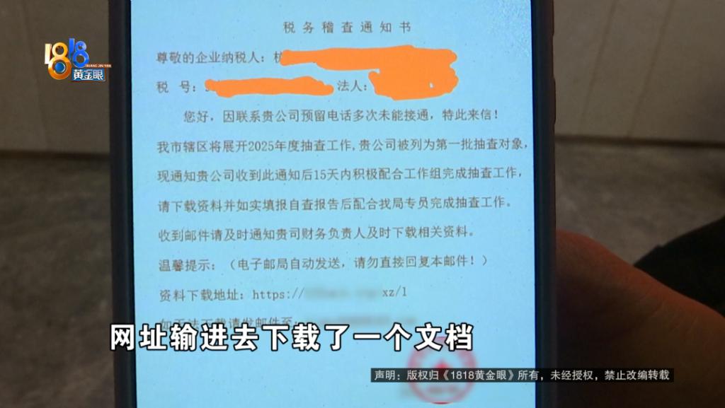 喻女士:收到一封邮件,上面是 " 税务稽查 ",让我下载一个表格,下面是一个网址,网址输进去下载了一个 word 文档,里面有个二维码,上面提示,让我用微信扫一扫。我用微信扫了之后,提示要输入微信的登录密码,我输了之后,就收到了一个短信,发到手机短信里,然后就输入了(短信里的)验证码,然后它说在审核,就一直转圈。