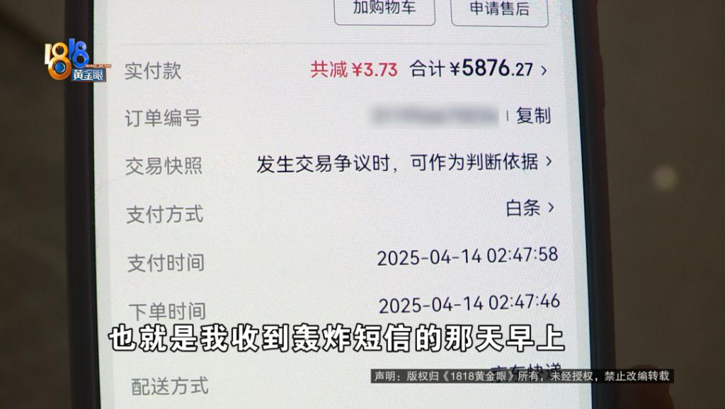 喻女士:我一看,就觉得很奇怪,就点进去看了一下,我发现那个已买到的宝贝里面,一个宝贝都没有,只能从白条里才看到买到的宝贝,我就立刻联系平台,我说这些都是诈骗分子买的东西,我没有买过这些东西,申请退货,把所有的订单都申请退货退款。