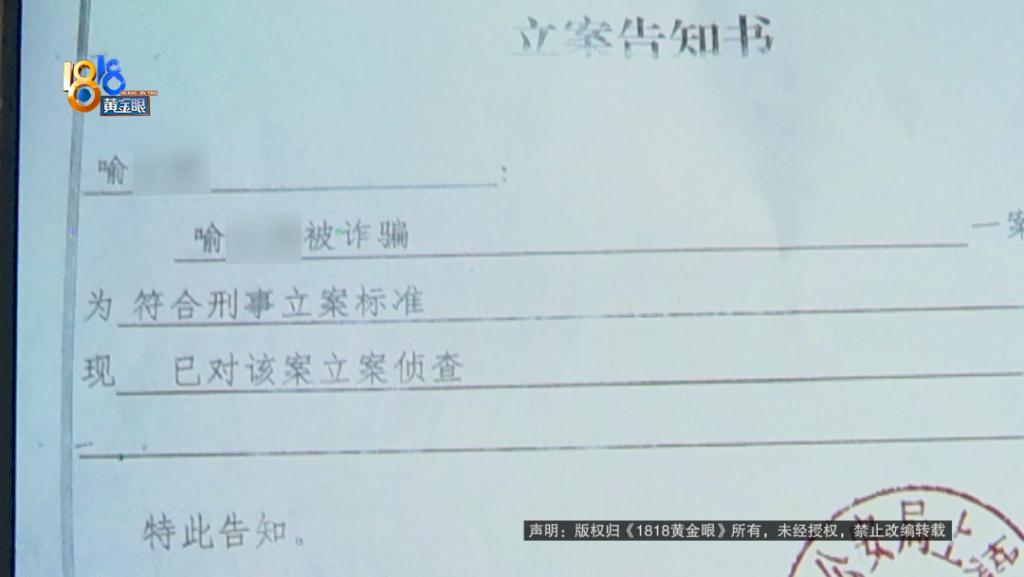 喻女士说,她报警后警方给她开具了立案说明,确认符合刑事立案标准,已经立案侦查。