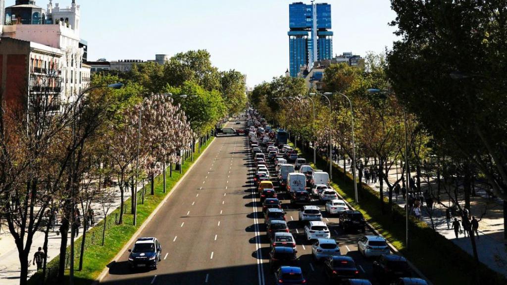 △马德里,一辆警车驶过,另一侧的车辆在交通拥堵中等待