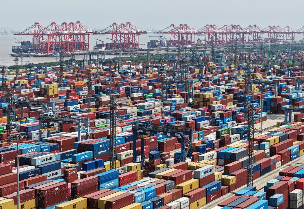 2025年4月20日,上海港一码头堆积的出口集装箱。视觉中国 图