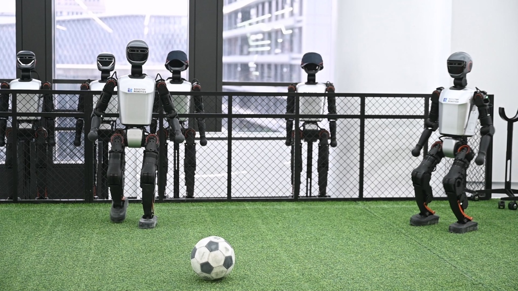 国家和地方共建人形机器人创新中心,人形机器人正在进行足球“训练”。澎湃新闻记者 张呈君 摄