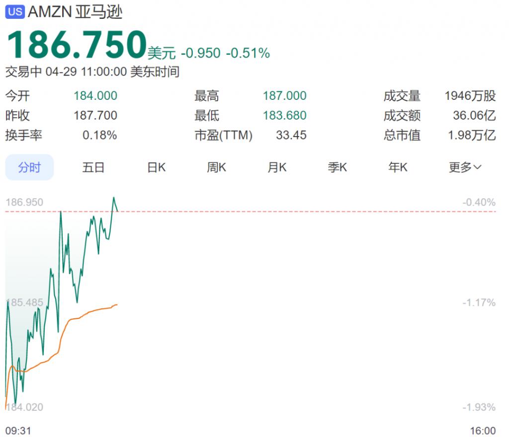 市场方面,亚马逊开盘大跌,一度跌超 2%。截至发稿,现跌 0.51%。