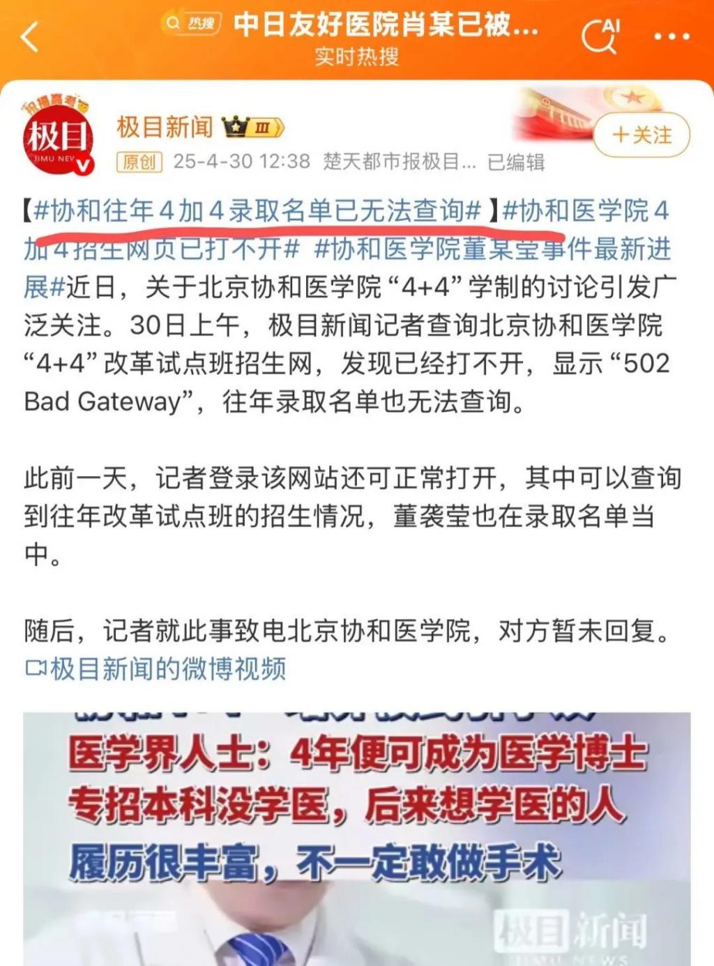诸如最新的热搜,协和往年 4+4 录取名单已无法查询,记者打开这个改革试点的招生网站,发现已经打不开,往年录取名单也无法查询。