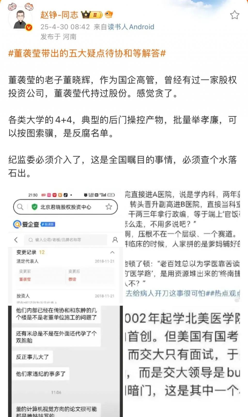 除此之外,网上也有人爆料说,董小姐的父亲作为国企高管,却曾经有过股权投资公司,建议纪委查一下。