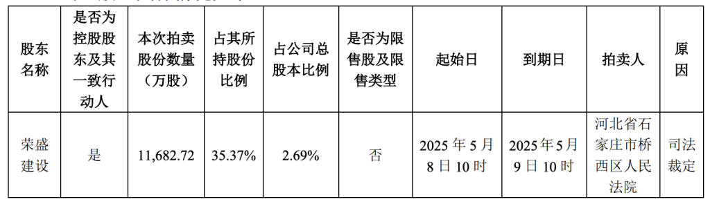 据荣盛建设函告:近日收到河北省石家庄市桥西区人民法院的执行裁定书及京东拍卖网查询,河北省石家庄市桥西区人民法院将于2025年5月8日10时至2025年5月9日10时止(延时除外)在京东网司法拍卖网络平台上公开拍卖荣盛建设持有的公司股票11682.72万股,起拍价为17880.4万元,折合每股价格为1.53元/股。