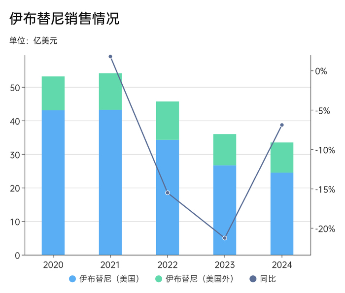 据艾伯维年报,2024年,伊布替尼33.47亿美元,同比下降6.9%。其中,美国市场贡献营收24.48亿美元,同比下降8.1%;美国以外的其他地区销售分成收入8.99亿美元,同比下降3.5%。