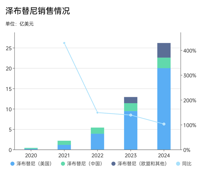 据百济神州年报,2024年,泽布替尼全球销售额达26亿美元。其中,在美国销售额共计20亿美元,比上一年的9.456亿美元,同比增长106.3%;欧洲销售额为3.588亿美元,同比增长193.6%;在中国销售额为2.581元美元,同比增长33.2%。