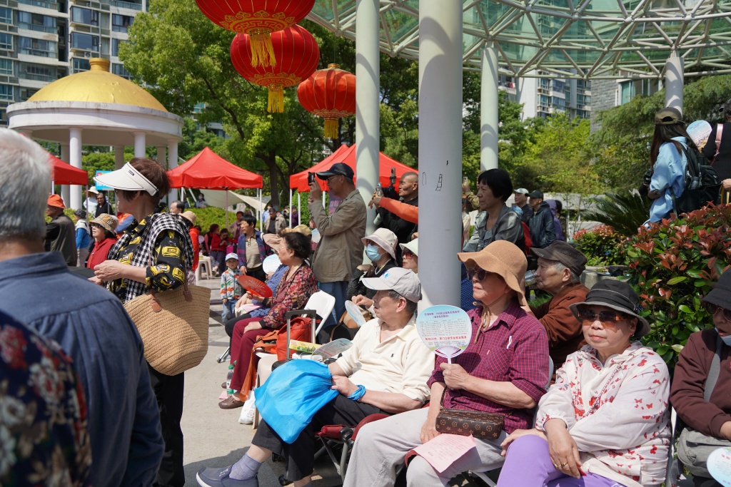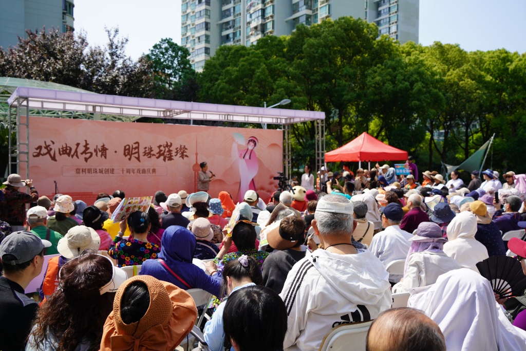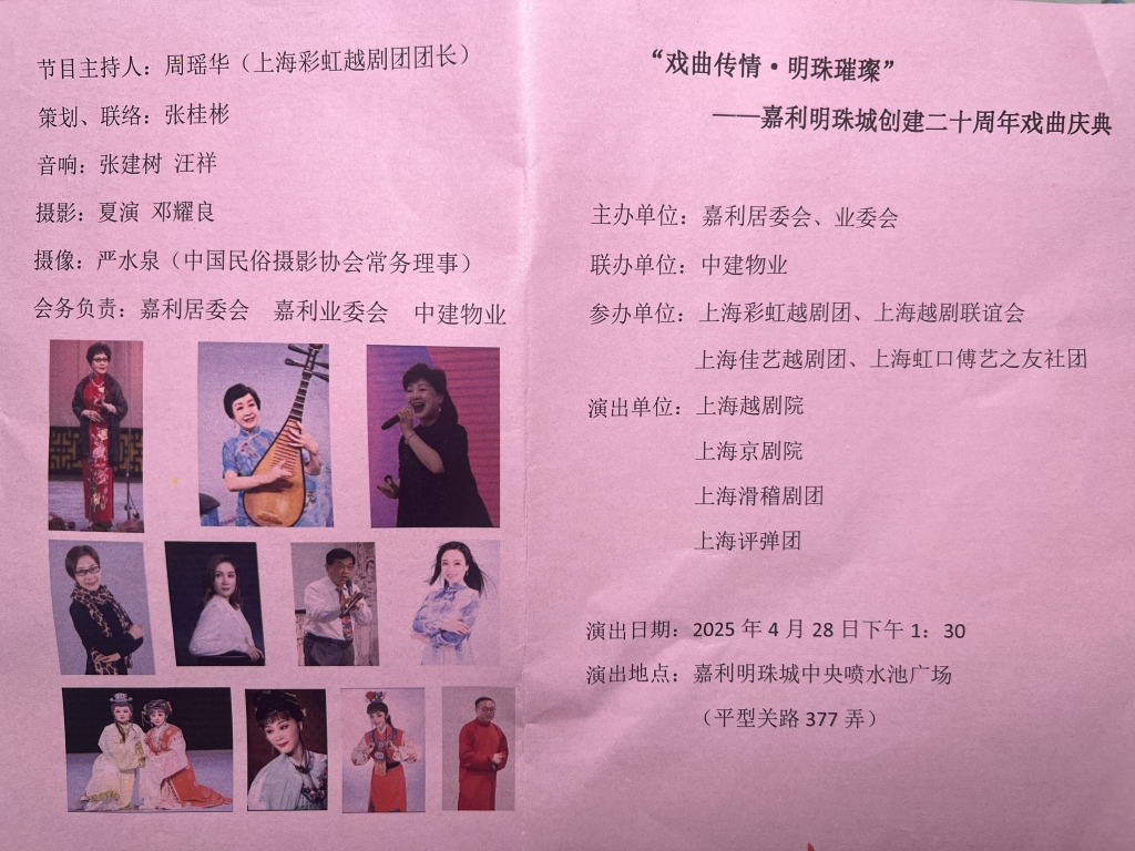 4月28日中午,上海嘉利明珠城小区热闹起来,陆续有居民赶到中央喷水池广场。当天,小区创建二十周年戏曲庆典在这里举行。这场由居委会、业委会主办的社区戏曲演出请来了越剧、评弹、京剧、上海说唱、滑稽戏等剧种的十几位戏曲名家,其中有七名是国家一级演员。