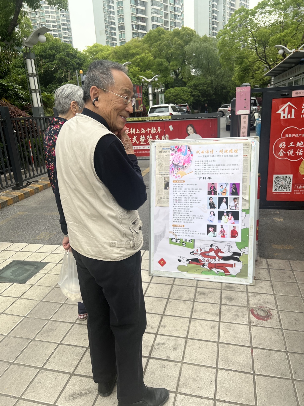在小区西北门,两位老年人扶着眼镜仔细研究节目单。张贵彬主动上前介绍,“28日下午1:30开始唱,12点半以后就可以来占座位了,不然可能坐不到。”