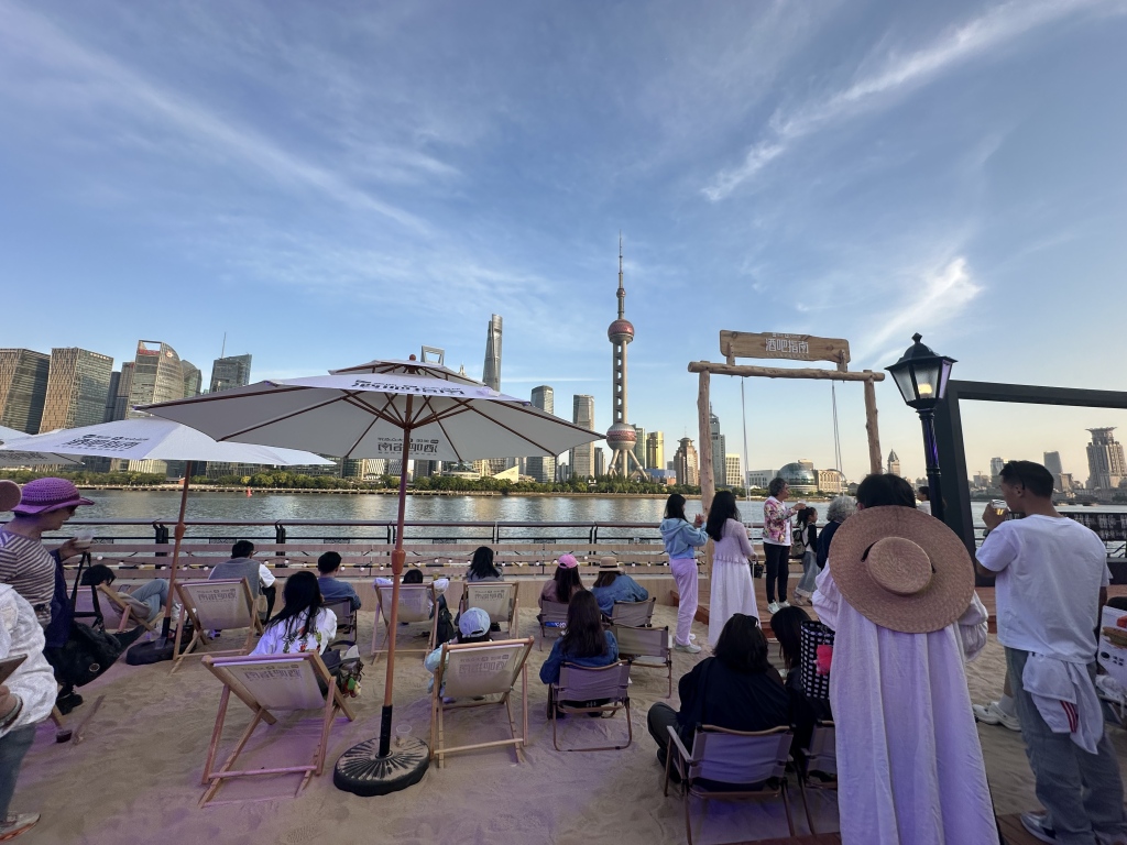 在这里,“去班味”的年轻人躺在黄浦江边的露营凳上,或短暂地自由“放空”,或吹着暖风观看一场露天电影;老年夫妻沿着滨江水岸休闲散步,也会好奇地排个长队,尝试一杯来自云南的手冲咖啡。