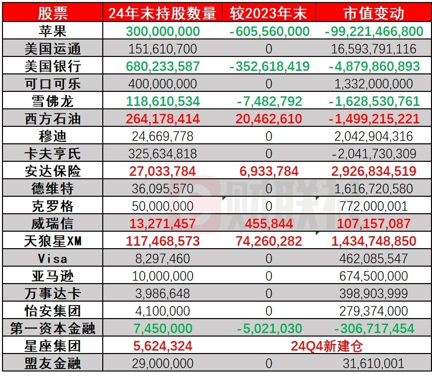 (伯克希尔持仓变动情况,来源:伯克希尔财报、财联社)