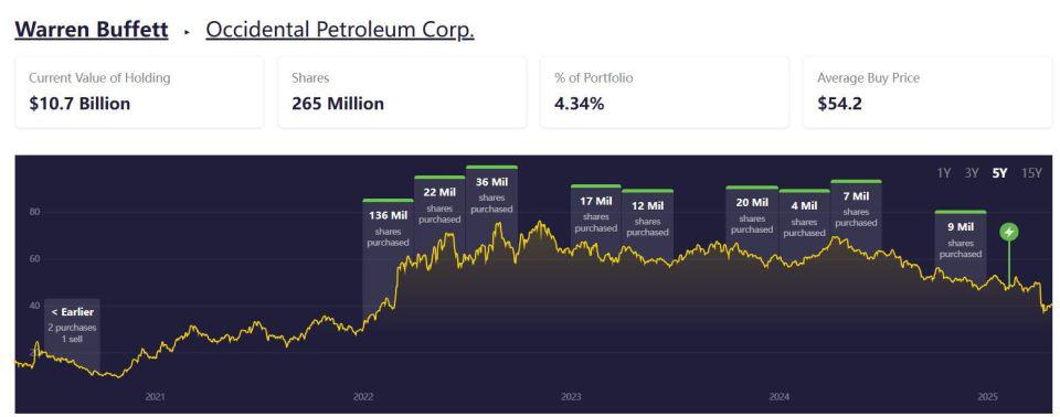 伯克希尔上一次增持西方石油是在今年 2 月,当时的股价为每股 47 美元,这可能是巴菲特觉得股价便宜的位置。