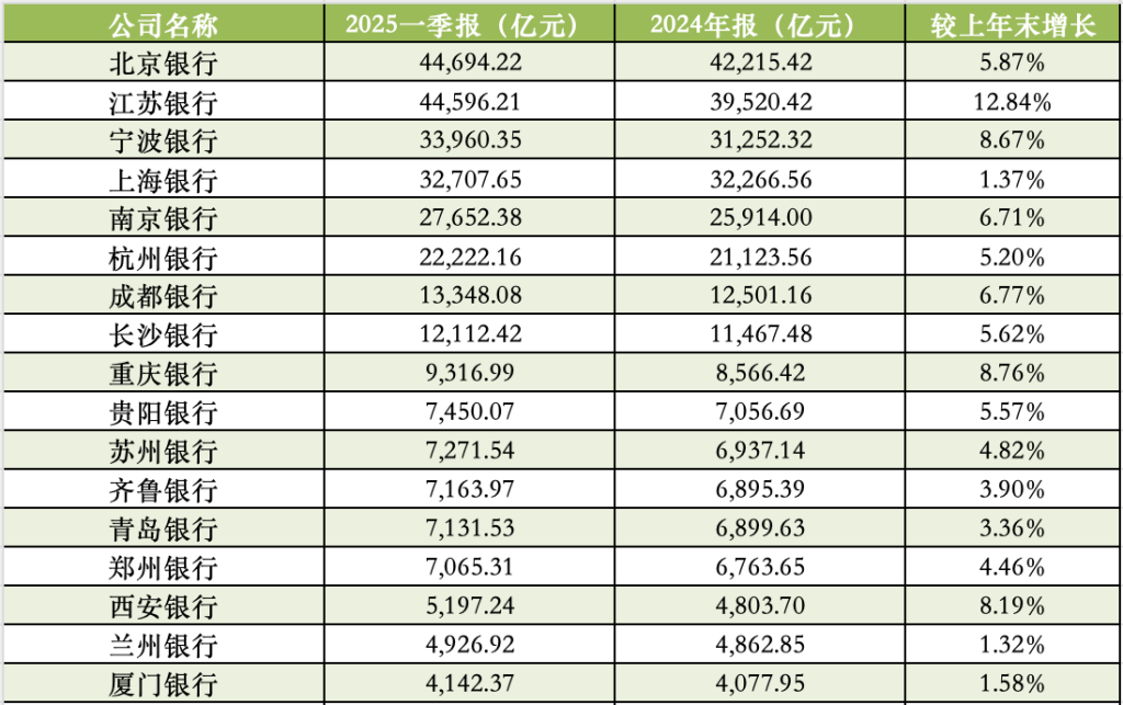 从资产规模看,截至2025年3月末,A股上市城商行资产规模总体较上年末增长6.53%,较上年同期的4.65%上升1.88个百分点。