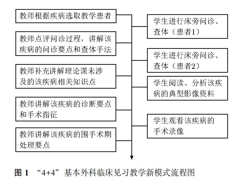 以基本外科为例,北京协和医院吴昕等人的文章介绍,2021 年 12 月至 2022 年 2 月,在 2020 级 "4+4" 试点班 25 名医学生中开展基本外科临床见习新教学模式,具体流程如下图所示。